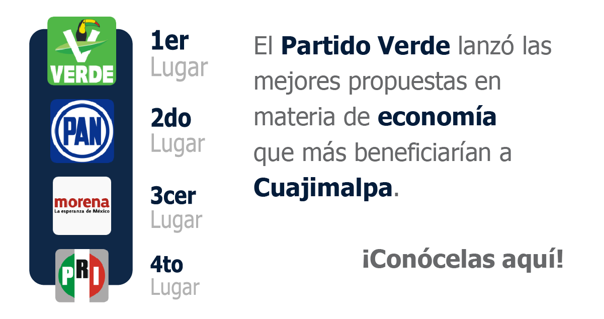 junio 4,11:33 AM By Panorama Mexicano El Partido Verde lanzó las mejores propuestas en materia de economía que más beneficiarían Cuajimalpa. ¡Conócelas aquí